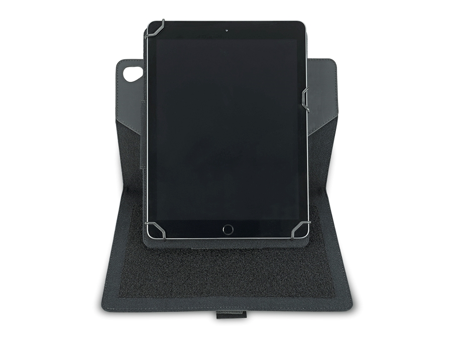 Inside, the rotating iPad frame holds the device securely and allows for 360-degree rotation of the iPad. An easel is built into the kneeboard for adjustable tilted viewing, in and out of the cockpit. The power port is accessible with the cover closed, a window exposes the camera lens for easy picture taking, and a small elastic loop securely holds a pencil, pen or stylus.